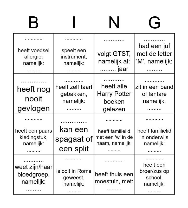 This bingo card has 16 words: ............ is ooit in Rome geweest, namelijk: ........., ............ heeft familielid in onderwijs namelijk: ........., ............ volgt GTST, namelijk al: ......... jaar, ............ heeft voedsel allergie, namelijk: ........., ............ heeft een paars kledingstuk, namelijk: ........., ............ speelt een instrument, namelijk: ........., ............ heeft familielid met een 'w' in de naam, namelijk: ........., ............ heeft thuis een moestuin, met: ........., ............ heeft nog nooit gevlogen, ............ heeft zelf taart gebakken, namelijk: ........., ............ weet zijn/haar bloedgroep, namelijk: ........., ............ had een juf met de letter 'M', namelijk: ........., ............ kan een spagaat of een split, ............ zit in een band of fanfare namelijk: ........., ............ heeft alle Harry Potter boeken gelezen and ............ heeft een broer/zus op school, namelijk: ..........