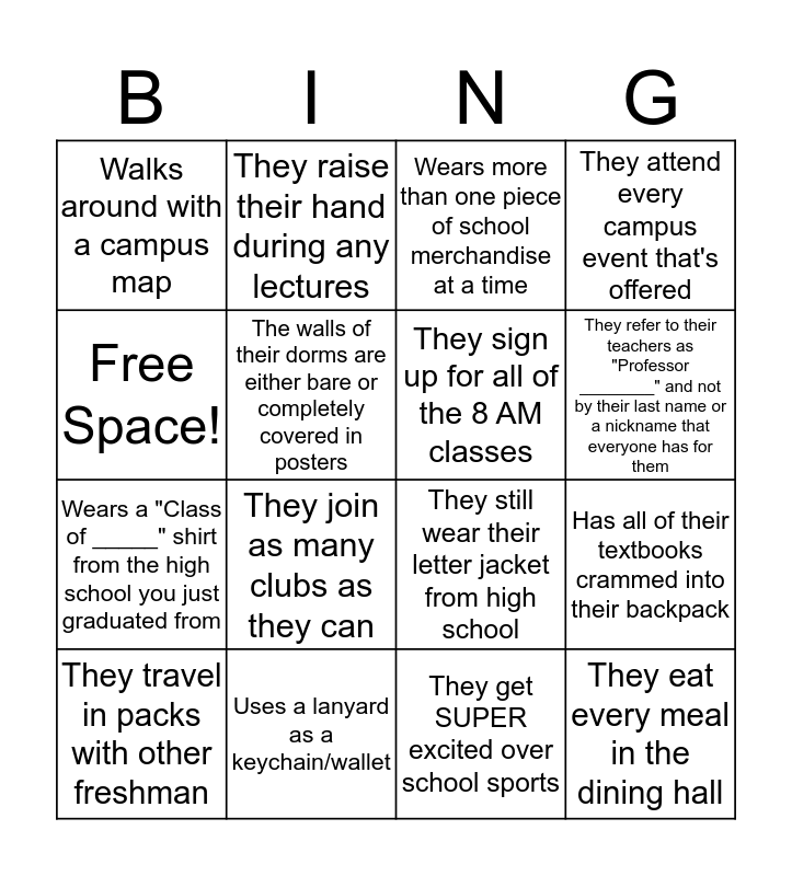 This bingo card has 16 words: Uses a lanyard as a keychain/wallet, Has all of their textbooks crammed into their backpack, Wears more than one piece of school merchandise at a time, Walks around with a campus map, Wears a "Class of _____" shirt from the high school you just graduated from, They raise their hand during any lectures, They still wear their letter jacket from high school, They get SUPER excited over school sports, Free Space!, The walls of their dorms are either bare or completely covered in posters, They travel in packs with other freshman, They attend every campus event that's offered, They join as many clubs as they can, They refer to their teachers as "Professor ________" and not by their last name or a nickname that everyone has for them, They sign up for all of the 8 AM classes and They eat every meal in the dining hall.