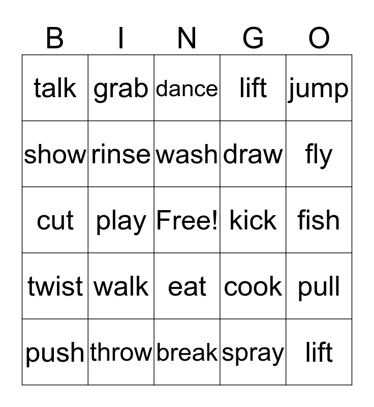 This bingo card has a free space and 24 words: walk, throw, wash, push, jump, talk, show, grab, kick, eat, draw, cut, cook, pull, rinse, spray, fish, dance, fly, play, lift, twist, lift and break.