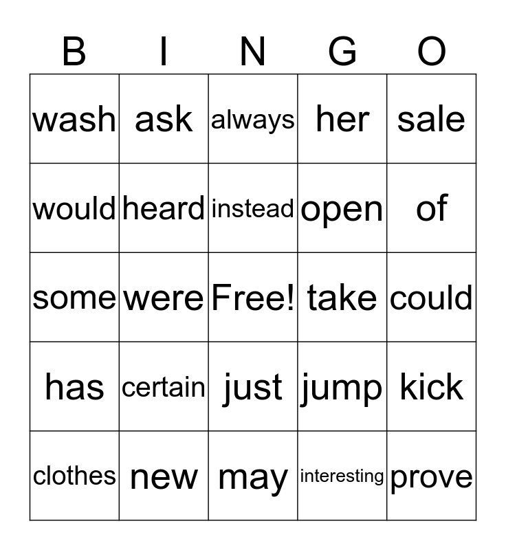 This bingo card has a free space and 24 words: certain, new, instead, clothes, sale, wash, would, ask, take, just, open, some, jump, kick, heard, interesting, could, always, of, were, prove, has, her and may.