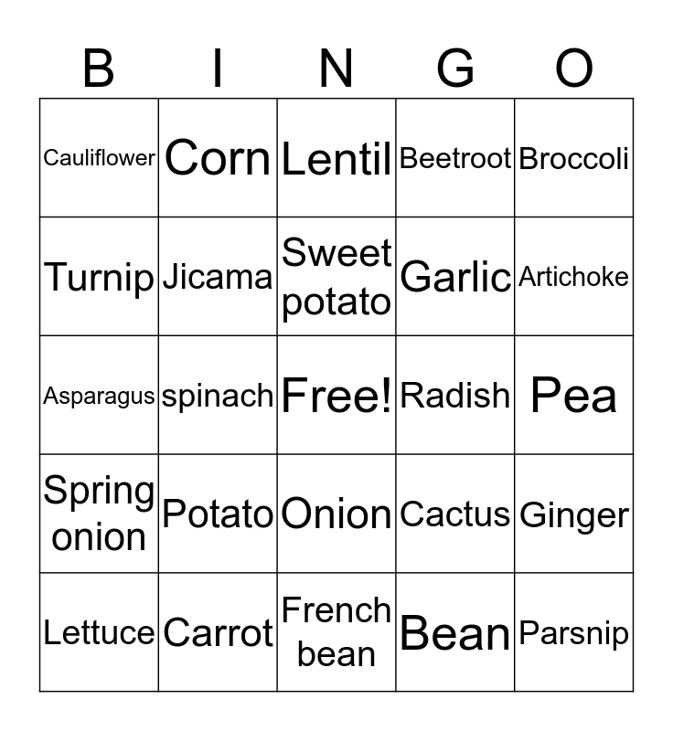 This bingo card has a free space and 24 words: Potato, Carrot, Sweet potato, Lettuce, Broccoli, Cauliflower, Turnip, Corn, Radish, Onion, Garlic, Asparagus, Cactus, Ginger, Jicama, Bean, Pea, Lentil, Artichoke, spinach, Parsnip, Spring onion, Beetroot and French bean.
