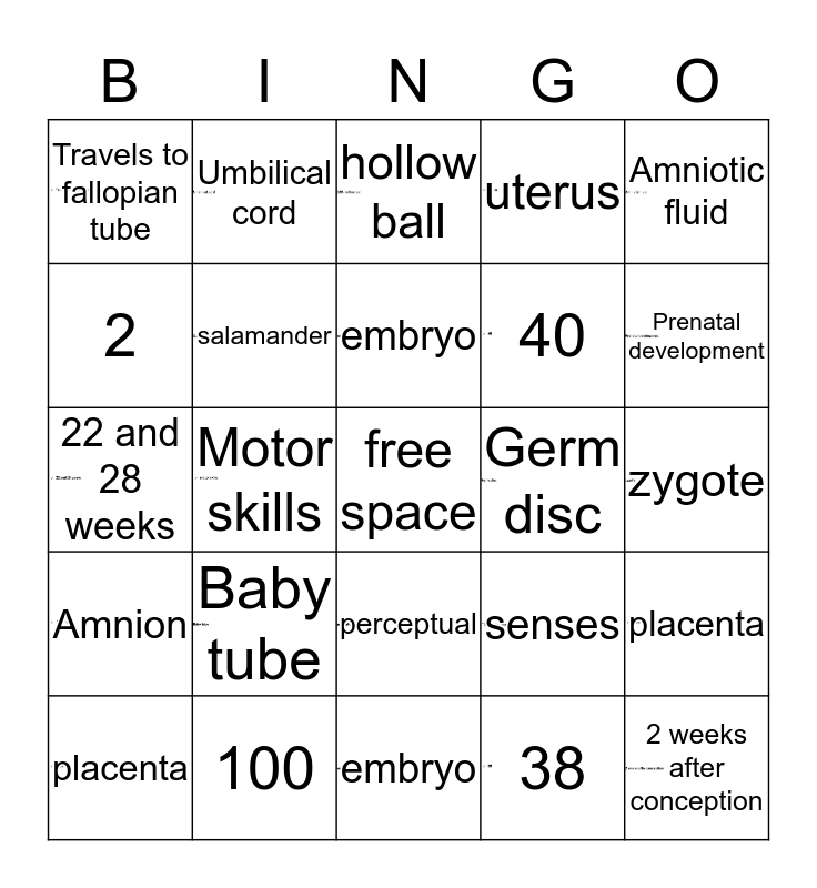This bingo card has 22 images, a free space and 24 words: placenta, Baby tube, embryo, 38, Amniotic fluid, Travels to fallopian tube, Umbilical cord, hollow ball, Germ disc, zygote, 22 and 28 weeks, salamander, senses, placenta, 2, 100, embryo, uterus, Prenatal development, Amnion, Motor skills, perceptual, 40 and 2 weeks after conception.
