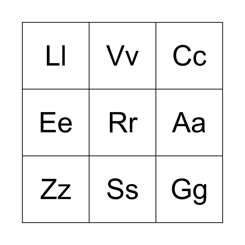This bingo card has a free space and 8 words: Aa, Cc, Vv, Zz, Ll, Gg, Ee and Ss.