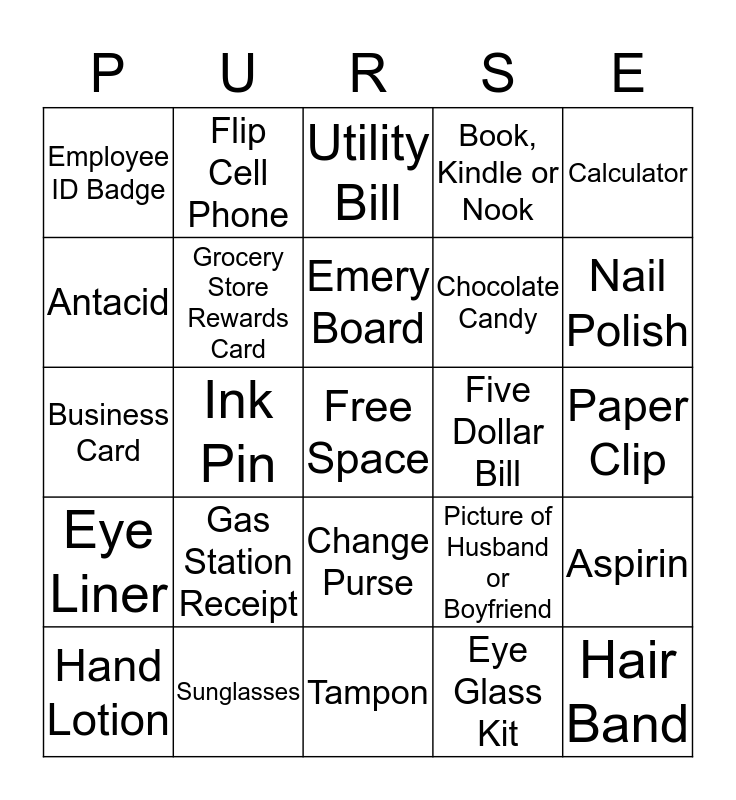 This bingo card has a free space and 24 words: Gas Station Receipt, Sunglasses, Emery Board, Hand Lotion, Calculator, Employee ID Badge, Antacid, Flip Cell Phone, Five Dollar Bill, Change Purse, Chocolate Candy, Business Card, Picture of Husband or Boyfriend, Aspirin, Grocery Store Rewards Card, Eye Glass Kit, Paper Clip, Utility Bill, Nail Polish, Ink Pin, Hair Band, Eye Liner, Book, Kindle or Nook and Tampon.