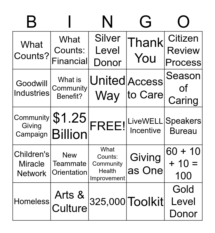 This bingo card has a free space and 35 words: Top Four Health Priorities, E-Pledge, CBISA, What is Community Benefit?, What Counts: Community Health Improvement, Thank You, Goodwill Industries, Housing and Stability, United Way, Record Service Hours, Community Giving Campaign, Citizen Review Process, Community Service Goal, Poverty, What Counts?, LiveWELL Incentive, Toolkit, $1.25 Billion, Children's Miracle Network, Gold Level Donor, Giving as One, Homeless, 60 + 10 + 10 = 100, Arts & Culture, Silver Level Donor, Season of Caring, What Counts: Community Building, Community Health Needs Assessment, Access to Care, Speakers Bureau, Children and Youth, 325,000, New Teammate Orientation, What Counts: Financial and Community Benefit Council.