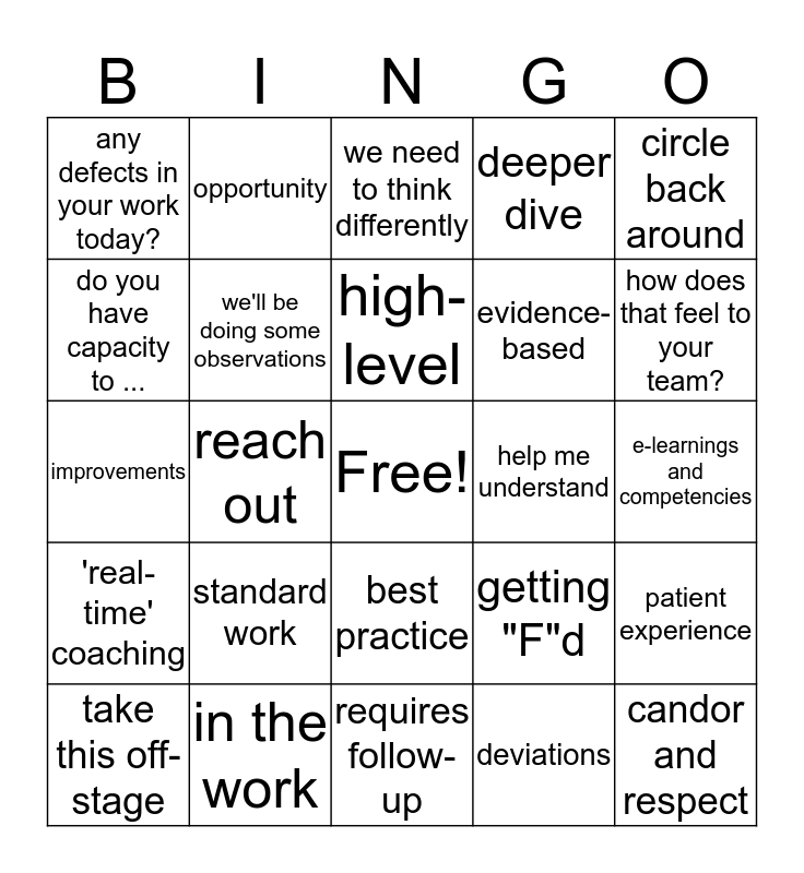 This bingo card has a free space and 24 words: standard work, in the work, high-level, take this off-stage, circle back around, any defects in your work today?, do you have capacity to ..., opportunity, help me understand, best practice, evidence-based, improvements, getting "F"d, patient experience, we'll be doing some observations, deviations, e-learnings and competencies, we need to think differently, how does that feel to your team?, reach out, candor and respect, 'real-time' coaching, deeper dive and requires follow-up.