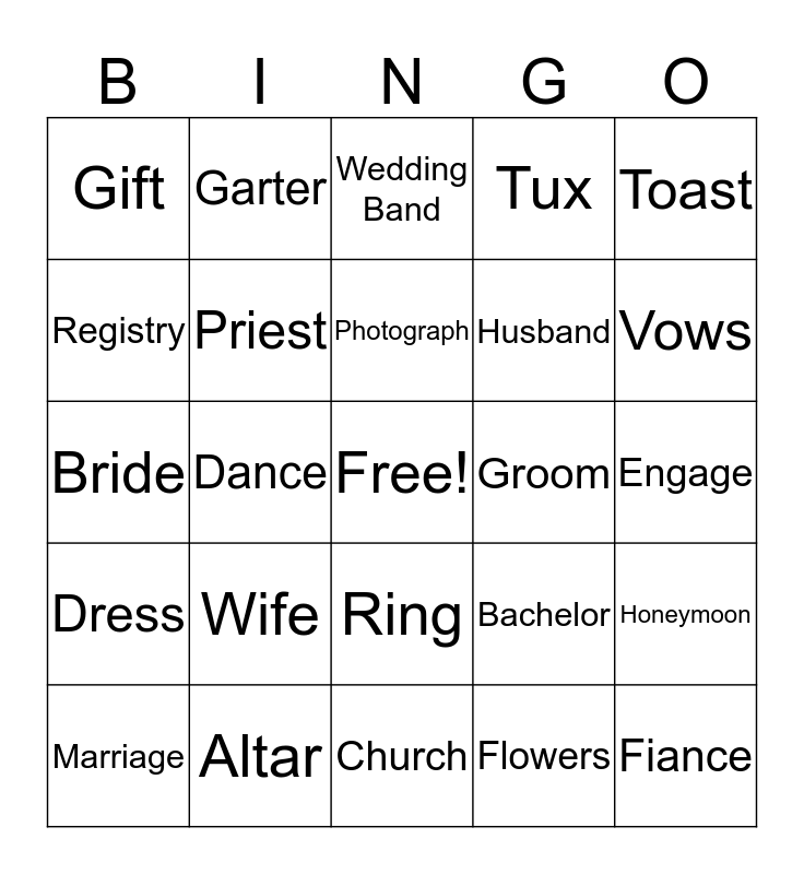This bingo card has a free space and 24 words: Wife, Altar, Photograph, Marriage, Toast, Gift, Registry, Garter, Groom, Ring, Husband, Bride, Bachelor, Honeymoon, Priest, Flowers, Engage, Wedding Band, Vows, Dance, Fiance, Dress, Tux and Church.