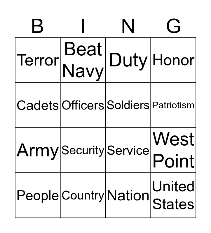 This bingo card has 16 words: Country, West Point, Duty, Terror, Army, Beat Navy, Service, Nation, Cadets, Officers, People, Honor, Security, Patriotism, Soldiers and United States.