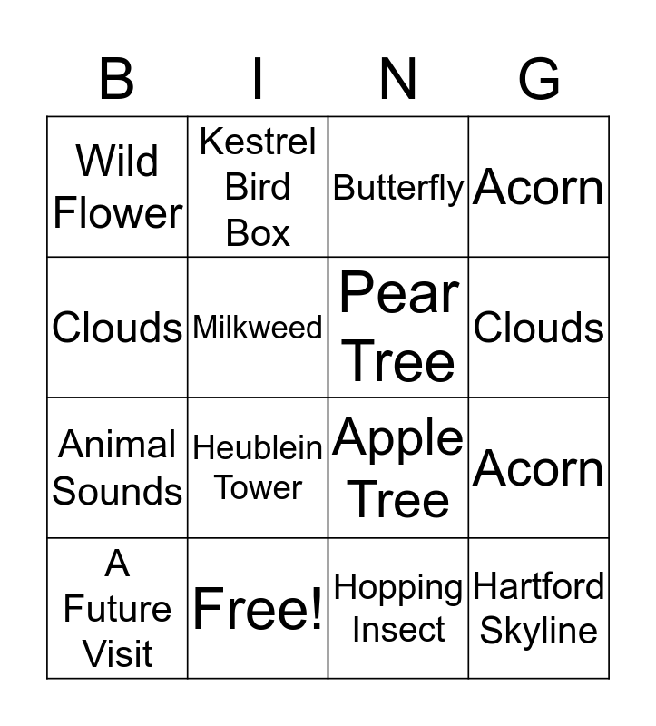 This bingo card has 19 words: Apple Tree, Hawk, Butterfly, Hartford Skyline, Acorn, Clouds, Hopping Insect, Wild Flower, Kestrel Bird Box, Animal Sounds, Heublein Tower, Milkweed, Pear Tree, Free!, A Future Visit, Dragonfly, Acorn, Clouds and Heublein Tower.