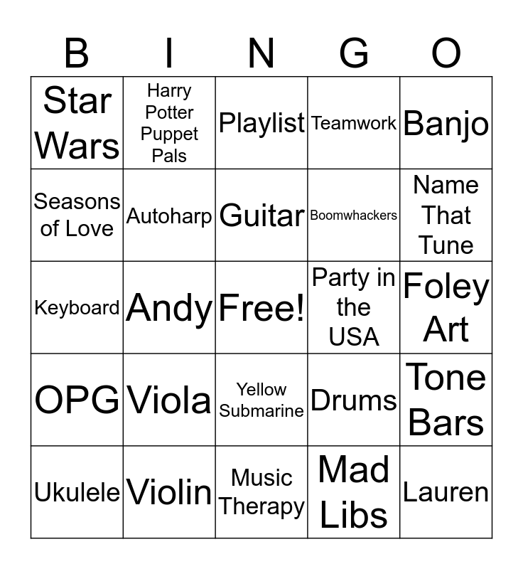 This bingo card has a free space and 24 words: Viola, Violin, Guitar, Ukulele, Banjo, Star Wars, Seasons of Love, Harry Potter Puppet Pals, Party in the USA, Yellow Submarine, Boomwhackers, Keyboard, Drums, Tone Bars, Autoharp, Mad Libs, Foley Art, Playlist, Name That Tune, Andy, Lauren, OPG, Teamwork and Music Therapy.
