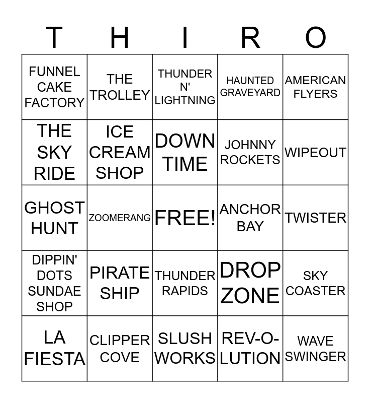 This bingo card has a free space and 42 words: BOULDER DASH, DOWN TIME, ENTERPRISE, PIRATE SHIP, REV-O-LUTION, SKY COASTER, WAVE SWINGER, WILDCAT, THUNDER N' LIGHTNING, THUNDER RAPIDS, TWISTER, WIPEOUT, ZOOMERANG, AMERICAN FLYERS, BUMPER CARS, DROP ZONE, CAROUSEL, GHOST HUNT, GIANT WHEEL, THE TROLLEY, THE SKY RIDE, CP HUNTINGTON TRAIN, ZOOMER'S GAS N' GO, FUNNEL CAKE FACTORY, LAKESIDE PATIO, STARLIGHT THEATER, JOHNNY ROCKETS, THE PIZZA PLACE, THE PIGHOUSE BBQ, FRIED BATS, POTATO PATCH, DIPPIN' DOTS SUNDAE SHOP, ICE CREAM SHOP, SLUSH WORKS, LAKE COMPOUNCE, LA FIESTA, CLIPPER COVE, ANCHOR BAY, PARKSIDE DINER, SAW MILL PLUNGE, HAUNTED GRAVEYARD and STAGE.