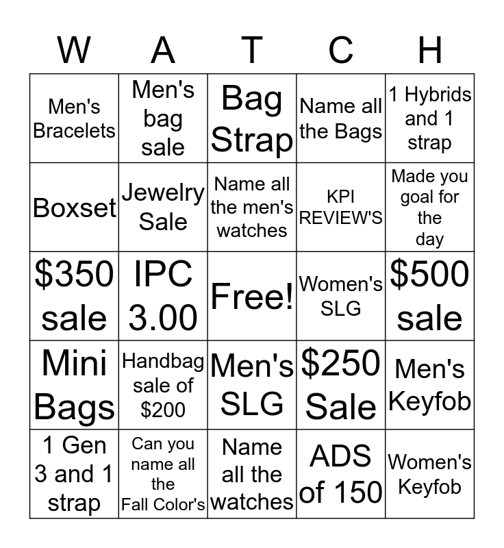 This bingo card has a free space and 24 words: Handbag sale of $200, Can you name all the Fall Color's, Name all the men's watches, 1 Gen 3 and 1 strap, 1 Hybrids and 1 strap, Men's Bracelets, Boxset, Men's bag sale, Women's SLG, Men's SLG, KPI REVIEW'S, $350 sale, $250 Sale, Men's Keyfob, Jewelry Sale, ADS of 150, $500 sale, Bag Strap, Made you goal for the day, IPC 3.00, Women's Keyfob, Mini Bags, Name all the Bags and Name all the watches.