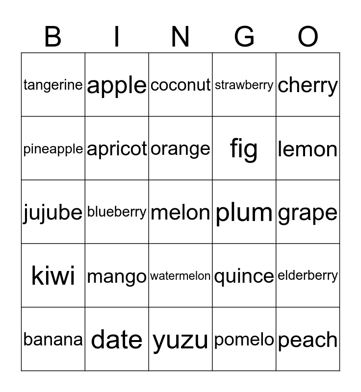 This bingo card has 25 words: mango, yuzu, orange, banana, cherry, tangerine, pineapple, apple, plum, watermelon, fig, jujube, quince, elderberry, apricot, peach, grape, coconut, lemon, blueberry, melon, date, kiwi, strawberry and pomelo.