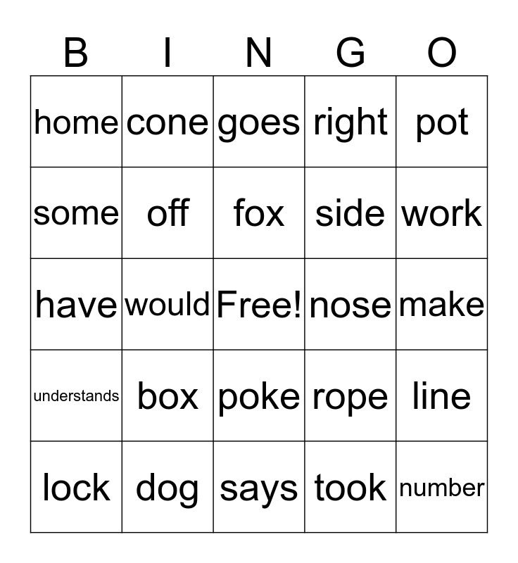 This bingo card has a free space and 24 words: box, dog, fox, lock, pot, home, some, cone, nose, poke, side, have, rope, line, off, took, make, goes, work, would, number, understands, right and says.