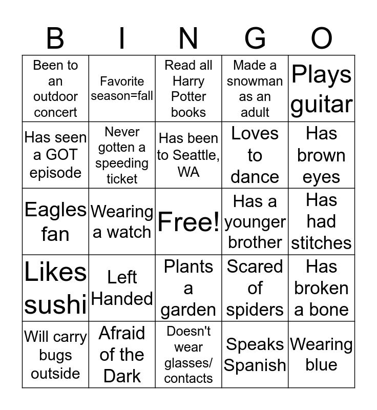 This bingo card has a free space and 24 words: Left Handed, Afraid of the Dark, Has been to Seattle, WA, Will carry bugs outside, Plays guitar, Been to an outdoor concert, Has seen a GOT episode, Favorite season=fall, Has a younger brother, Plants a garden, Loves to dance, Eagles fan, Scared of spiders, Has broken a bone, Never gotten a speeding ticket, Speaks Spanish, Has had stitches, Read all Harry Potter books, Has brown eyes, Wearing a watch, Wearing blue, Likes sushi, Made a snowman as an adult and Doesn't wear glasses/ contacts.