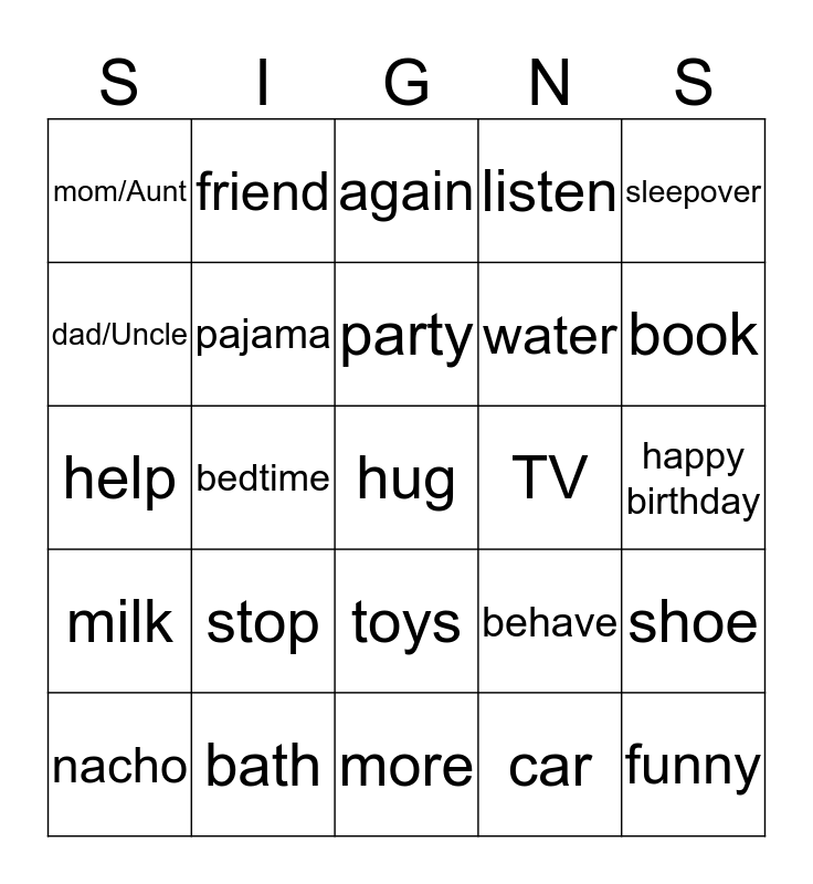 This bingo card has 25 words: stop, more, party, nacho, sleepover, mom/Aunt, dad/Uncle, friend, TV, toys, water, help, behave, shoe, pajama, funny, happy birthday, again, book, bedtime, hug, bath, milk, listen and car.