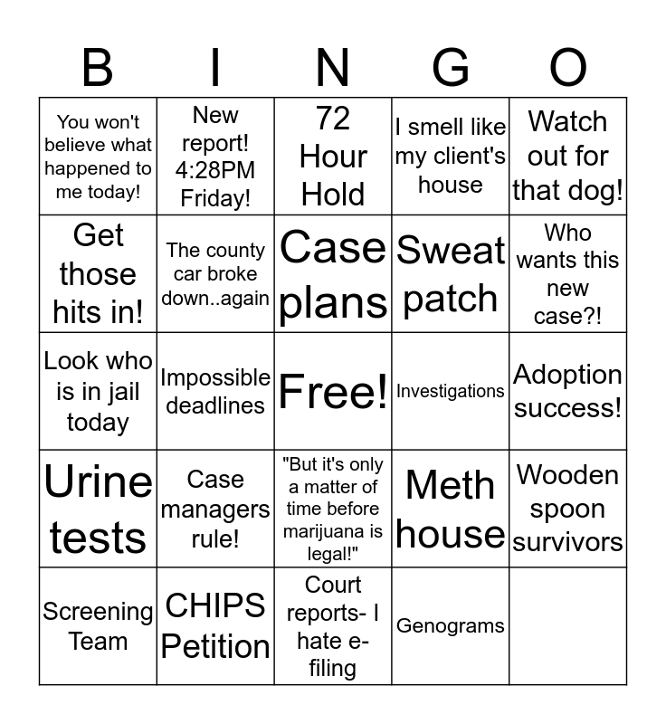 This bingo card has a free space and 24 words: Urine tests, CHIPS Petition, "But it's only a matter of time before marijuana is legal!", Meth house, Watch out for that dog!, You won't believe what happened to me today!, New report! 4:28PM Friday!, 72 Hour Hold, Sweat patch, Wooden spoon survivors, Get those hits in!, The county car broke down..again, CP ROCKS, Investigations, Who wants this new case?!, Screening Team, Impossible deadlines, Case plans, I smell like my client's house, Adoption success!, Look who is in jail today, Case managers rule!, Court reports- I hate e-filing and Genograms.