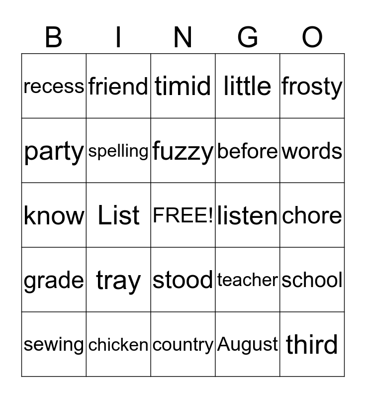 This bingo card has a free space and 24 words: tray, chicken, fuzzy, sewing, frosty, recess, party, friend, listen, stood, before, know, teacher, school, spelling, August, chore, timid, words, List, third, grade, little and country.