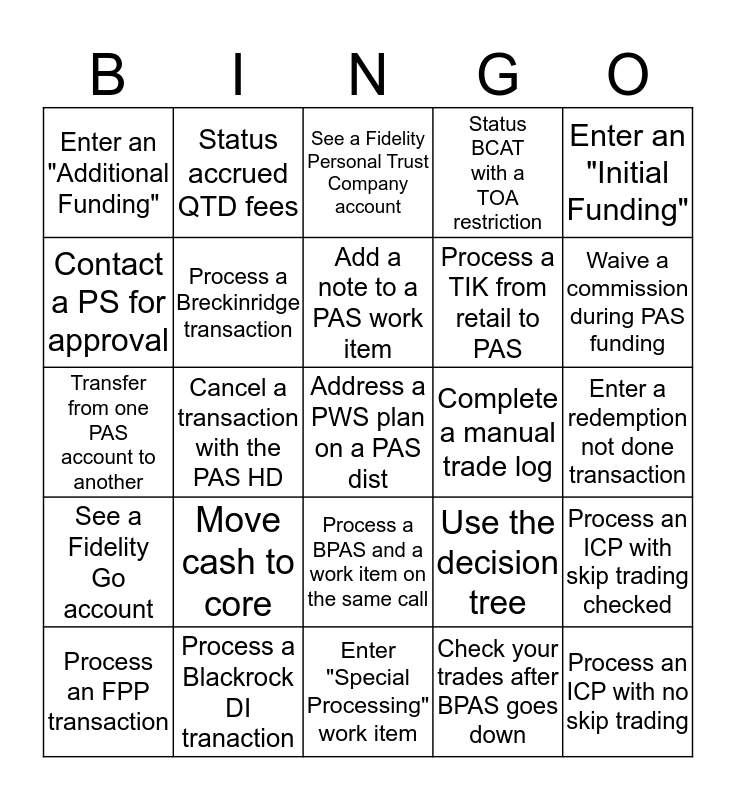 This bingo card has 25 words: Move cash to core, Enter "Special Processing" work item, Add a note to a PAS work item, Process an FPP transaction, Enter an "Initial Funding", Enter an "Additional Funding", Contact a PS for approval, Status accrued QTD fees, Complete a manual trade log, Process a BPAS and a work item on the same call, Process a TIK from retail to PAS, Transfer from one PAS account to another, Use the decision tree, Process an ICP with skip trading checked, Process a Breckinridge transaction, Process an ICP with no skip trading, Enter a redemption not done transaction, See a Fidelity Personal Trust Company account, Waive a commission during PAS funding, Cancel a transaction with the PAS HD, Address a PWS plan on a PAS dist, Process a Blackrock DI tranaction, See a Fidelity Go account, Status BCAT with a TOA restriction and Check your trades after BPAS goes down.