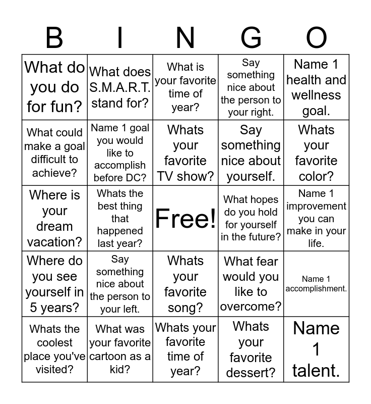 This bingo card has a free space and 24 words: Say something nice about the person to your left., What was your favorite cartoon as a kid?, Whats your favorite TV show?, Whats the coolest place you've visited?, Name 1 health and wellness goal., What do you do for fun?, What could make a goal difficult to achieve?, What does S.M.A.R.T. stand for?, What hopes do you hold for yourself in the future?, Whats your favorite song?, Say something nice about yourself., Where is your dream vacation?, What fear would you like to overcome?, Name 1 accomplishment., Name 1 goal you would like to accomplish before DC?, Whats your favorite dessert?, Name 1 improvement you can make in your life., What is your favorite time of year?, Whats your favorite color?, Whats the best thing that happened last year?, Name 1 talent., Where do you see yourself in 5 years?, Say something nice about the person to your right. and Whats your favorite time of year?.
