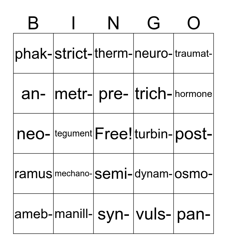 This bingo card has a free space and 24 words: mechano-, manill-, pre-, ameb-, traumat-, phak-, an-, strict-, turbin-, semi-, trich-, neo-, dynam-, osmo-, metr-, vuls-, post-, therm-, hormone, tegument, pan-, ramus, neuro- and syn-.