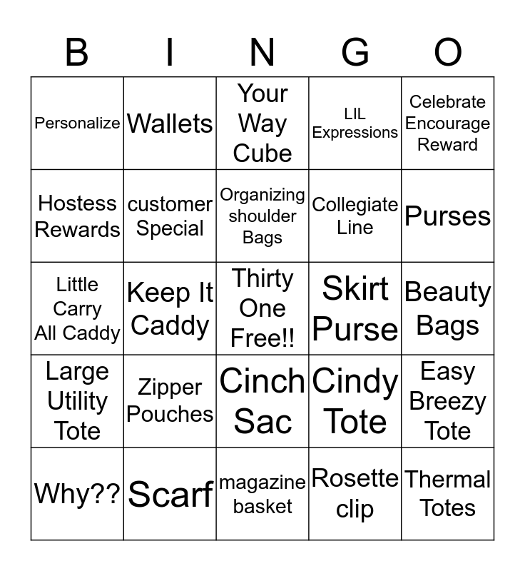 This bingo card has a free space and 24 words: Zipper Pouches, Scarf, Organizing shoulder Bags, Why??, Celebrate Encourage Reward, Personalize, Hostess Rewards, Wallets, Skirt Purse, Cinch Sac, Collegiate Line, Little Carry All Caddy, Cindy Tote, Easy Breezy Tote, customer Special, Rosette clip, Beauty Bags, Your Way Cube, Purses, Keep It Caddy, Thermal Totes, Large Utility Tote, LIL Expressions and magazine basket.