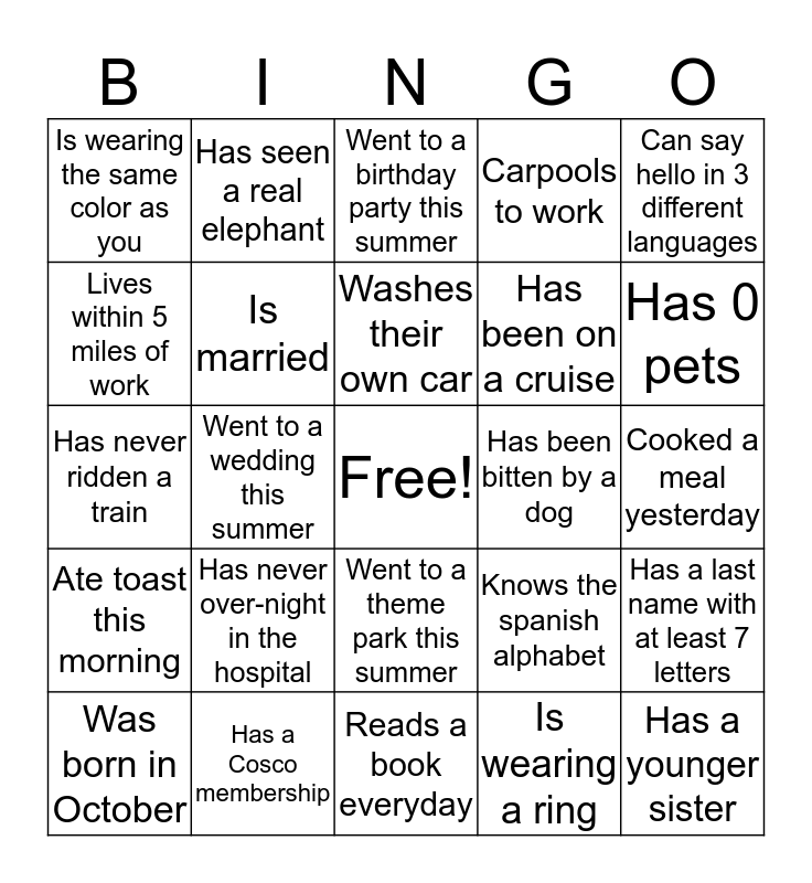 This bingo card has a free space and 24 words: Has never over-night in the hospital, Has a Cosco membership, Washes their own car, Was born in October, Can say hello in 3 different languages, Is wearing the same color as you, Lives within 5 miles of work, Has seen a real elephant, Has been bitten by a dog, Went to a theme park this summer, Has been on a cruise, Has never ridden a train, Knows the spanish alphabet, Has a last name with at least 7 letters, Is married, Is wearing a ring, Cooked a meal yesterday, Went to a birthday party this summer, Has 0 pets, Went to a wedding this summer, Has a younger sister, Ate toast this morning, Carpools to work and Reads a book everyday.