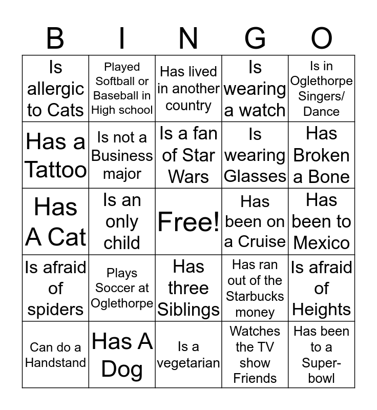 This bingo card has a free space and 24 words: Plays Soccer at Oglethorpe, Has A Dog, Is a fan of Star Wars, Can do a Handstand, Is in Oglethorpe Singers/ Dance, Is allergic to Cats, Has a Tattoo, Played Softball or Baseball in High school, Has been on a Cruise, Has three Siblings, Is wearing Glasses, Has A Cat, Has ran out of the Starbucks money, Is afraid of Heights, Is not a Business major, Watches the TV show Friends, Has been to Mexico, Has lived in another country, Has Broken a Bone, Is an only child, Has been to a Super-bowl, Is afraid of spiders, Is wearing a watch and Is a vegetarian.