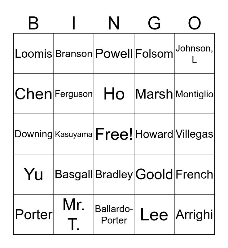 This bingo card has a free space and 51 words: Aguirre, Arrighi, Autran, Ballardo-Porter, Basgall, Bourjeili, Branson, Campbell, Chen, Copeland, Ferguson, Folsom, French, Goold, Harrison, Hart, Ho, Howard, Joe, Johnson, L, Kasuyama, Lee, Loomis, Marsh, Maurey, Millan, Montiglio, Paulino, Porter, Powell, Reina, Smith, Steinkamp, Sweet, Taylor, Mr. T., Tran, Tu, VanGorder, Vasquez, Villegas, Yu, Zamora, Johnson, J, Flores, Wong, Downing, Martin, Salazar, Bradley and Mr. Will.