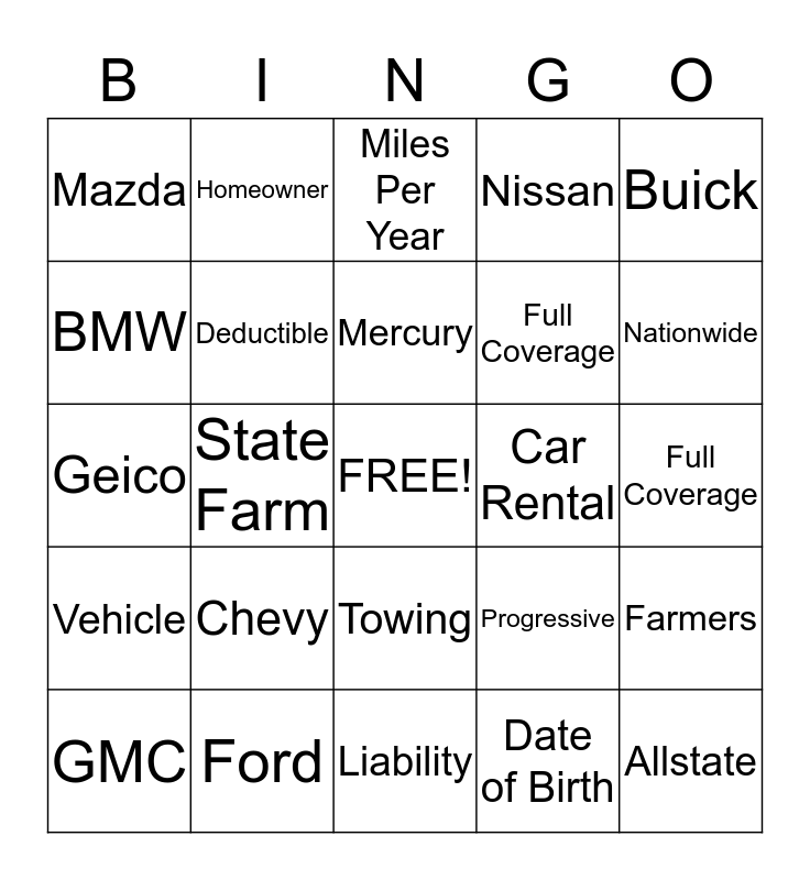 This bingo card has a free space and 24 words: Chevy, Ford, Mercury, GMC, Buick, Mazda, BMW, Homeowner, Car Rental, Towing, Full Coverage, Geico, Progressive, Farmers, Deductible, Date of Birth, Full Coverage, Miles Per Year, Nationwide, State Farm, Allstate, Vehicle, Nissan and Liability.