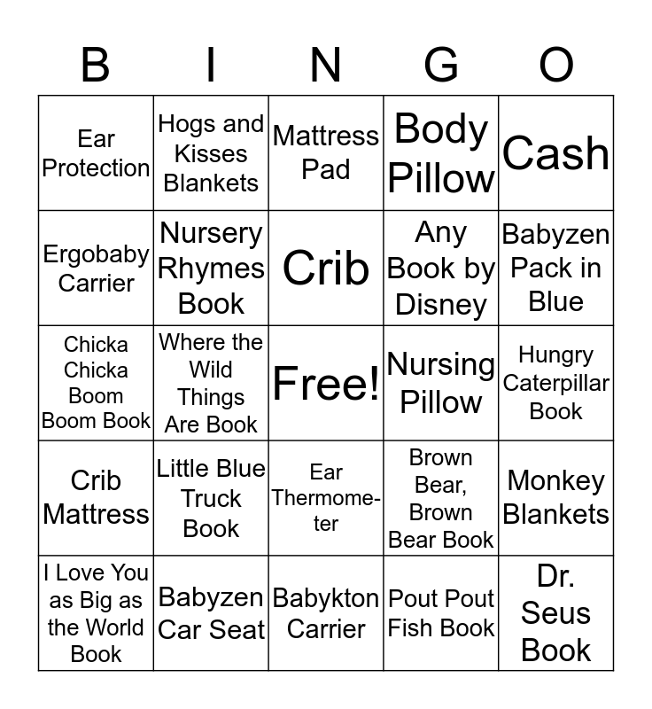 This bingo card has a free space and 24 words: I Love You as Big as the World Book, Little Blue Truck Book, Crib, Pout Pout Fish Book, Cash, Ear Protection, Hogs and Kisses Blankets, Mattress Pad, Nursing Pillow, Hungry Caterpillar Book, Chicka Chicka Boom Boom Book, Nursery Rhymes Book, Brown Bear, Brown Bear Book, Monkey Blankets, Ergobaby Carrier, Babyzen Car Seat, Babykton Carrier, Body Pillow, Babyzen Pack in Blue, Crib Mattress, Where the Wild Things Are Book, Ear Thermome- ter, Any Book by Disney and Dr. Seus Book.