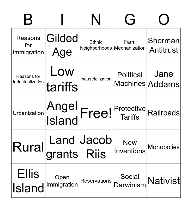 This bingo card has a free space and 26 words: Jacob Riis, Social Darwinism, Industrialization, Open Immigration, Sherman Antitrust, Reasons for Immigration, Reasons for Industrialization, Gilded Age, Railroads, New Inventions, Political Machines, Urbanization, Monopolies, Ellis Island, Angel Island, Chinese Exclusion, Farm Mechanization, Rural, Ethnic Neighborhoods, Nativist, Jane Addams, Reservations, Protective Tariffs, Land grants, Low tariffs and Assimilation.