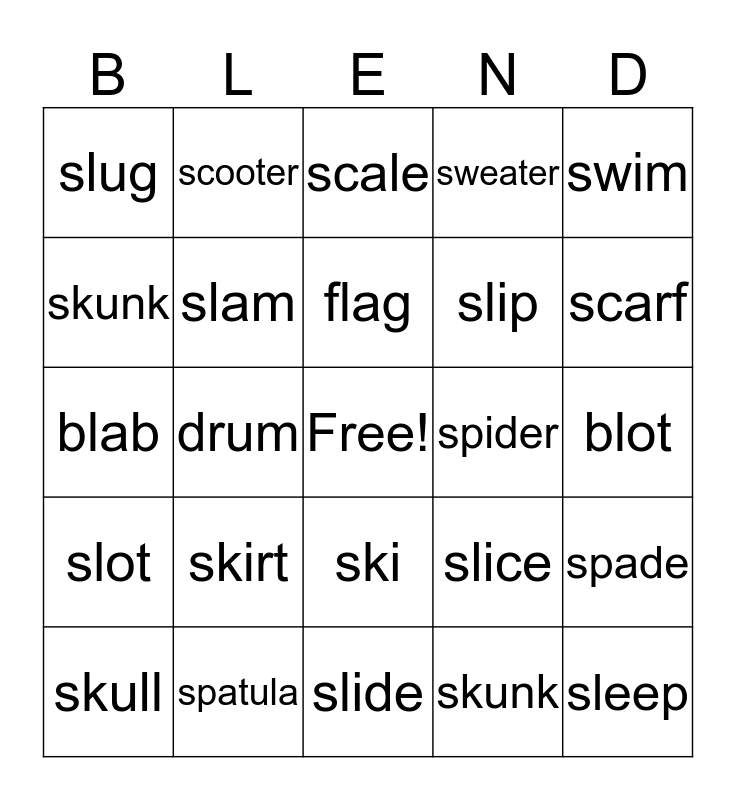 This bingo card has a free space and 48 words: spoon, sling, swan, sleep, scarf, skull, scooter, swing, spider, score, skunk, slam, slip, spade, ski, spy, scale, slice, skate, slug, spatula, slide, sweater, swim, drag, drum, flag, glad, blot, blab, swim, swop, snake, plum, slot, sled, slug, skunk, sleep, drip, slam, ski, slip, scout, skirt, sweep, scoop and spoll.