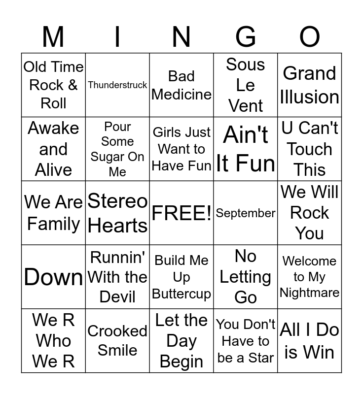 This bingo card has a free space and 24 words: Runnin' With the Devil, Crooked Smile, Girls Just Want to Have Fun, We R Who We R, Grand Illusion, Old Time Rock & Roll, Awake and Alive, Thunderstruck, September, Build Me Up Buttercup, Ain't It Fun, We Are Family, No Letting Go, Welcome to My Nightmare, Pour Some Sugar On Me, You Don't Have to be a Star, We Will Rock You, Bad Medicine, U Can't Touch This, Stereo Hearts, All I Do is Win, Down, Sous Le Vent and Let the Day Begin.