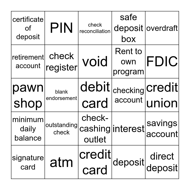 This bingo card has 30 words: atm, bank statement, blank endorsement, canceled check, certificate of deposit, check reconciliation, check register, check-cashing outlet, checking account, credit card, credit union, debit card, deposit, direct deposit, FDIC, financial institutions, interest, minimum daily balance, outstanding check, overdraft, pawn shop, payroll cash advance, PIN, Rent to own program, retirement account, safe deposit box, savings account, signature card, void and withdrawal.