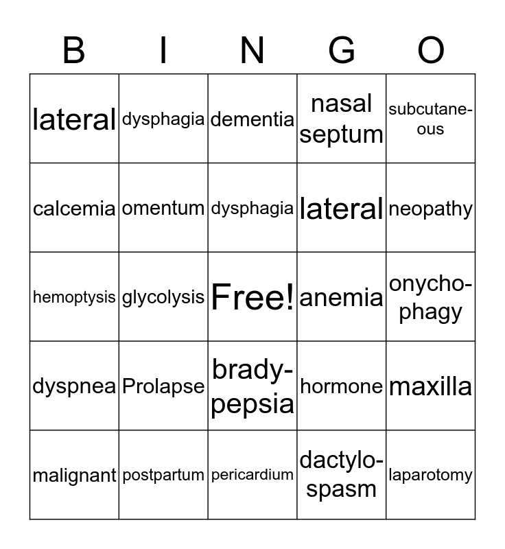 This bingo card has a free space and 24 words: Prolapse, postpartum, dysphagia, malignant, subcutane-ous, lateral, calcemia, dysphagia, anemia, brady- pepsia, lateral, hemoptysis, hormone, maxilla, omentum, dactylo-spasm, onycho-phagy, dementia, neopathy, glycolysis, laparotomy, dyspnea, nasal septum and pericardium.