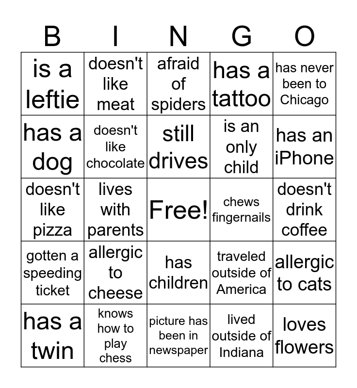 This bingo card has a free space and 24 words: allergic to cheese, knows how to play chess, still drives, has a twin, has never been to Chicago, is a leftie, has a dog, doesn't like meat, chews fingernails, has children, is an only child, doesn't like pizza, traveled outside of America, allergic to cats, doesn't like chocolate, lived outside of Indiana, doesn't drink coffee, afraid of spiders, has an iPhone, lives with parents, loves flowers, gotten a speeding ticket, has a tattoo and picture has been in newspaper.