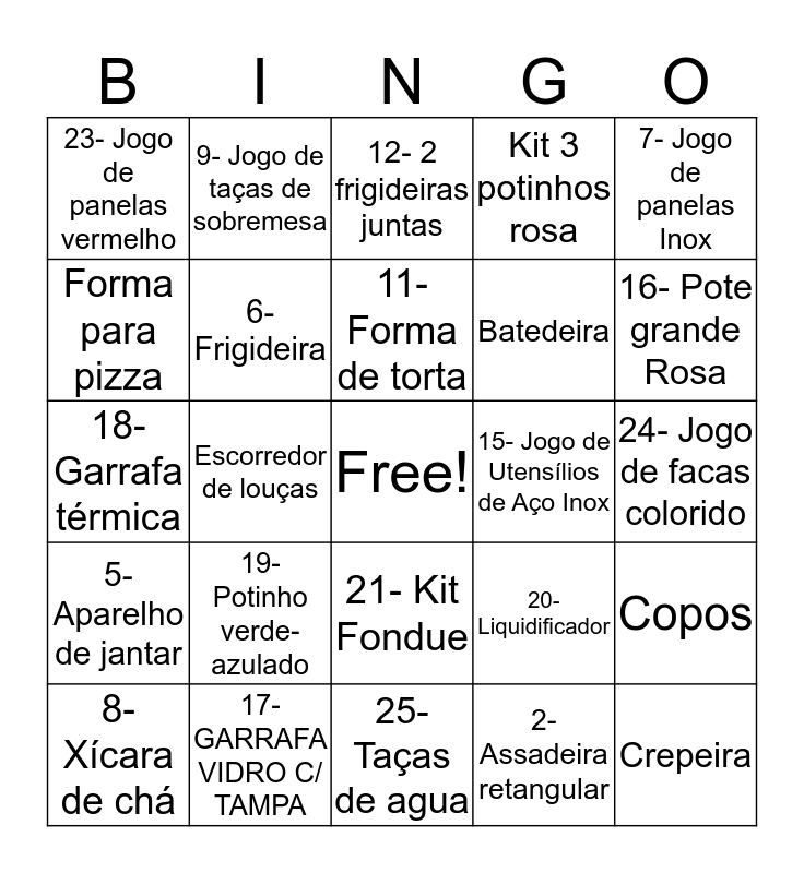 This bingo card has a free space and 34 words: 1- Assadeira redonda, 2- Assadeira retangular, 3- Jogo de pizza, 4- Bule térmico, 5- Aparelho de jantar, 6- Frigideira, 7- Jogo de panelas Inox, 8- Xícara de chá, 9- Jogo de taças de sobremesa, 10- Varal de chão, 11- Forma de torta, 12- 2 frigideiras juntas, 13- Panela de pressão, 14- 3 potinhos de vidro, 15- Jogo de Utensílios de Aço Inox, 16- Pote grande Rosa, 17- GARRAFA VIDRO C/ TAMPA, 18- Garrafa térmica, 19- Potinho verde-azulado, 20- Liquidificador, 21- Kit Fondue, 22- Ferro de Passar, 23- Jogo de panelas vermelho, 24- Jogo de facas colorido, 25- Taças de agua, Crepeira, Kit 3 potinhos rosa, Taça de Vinho, Batedeira, Forma para pizza, Faqueiro, Escorredor de louças, Copos and Marinex com tampa.