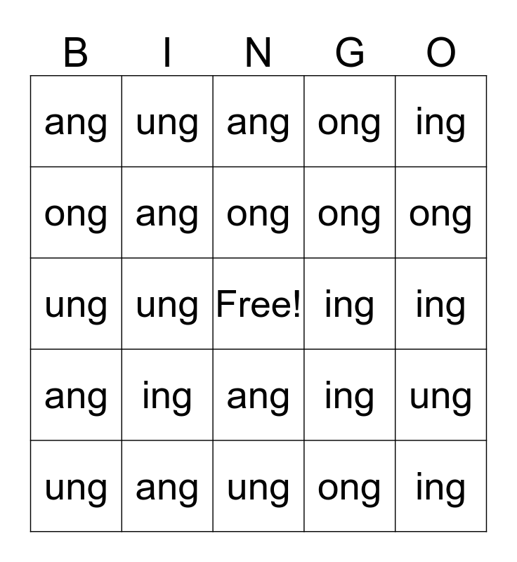 This bingo card has a free space and 24 words: ing, ang, ong, ung, ing, ang, ong, ung, ing, ang, ong, ung, ing, ung, ang, ong, ing, ang, ong, ung, ing, ang, ong and ung.