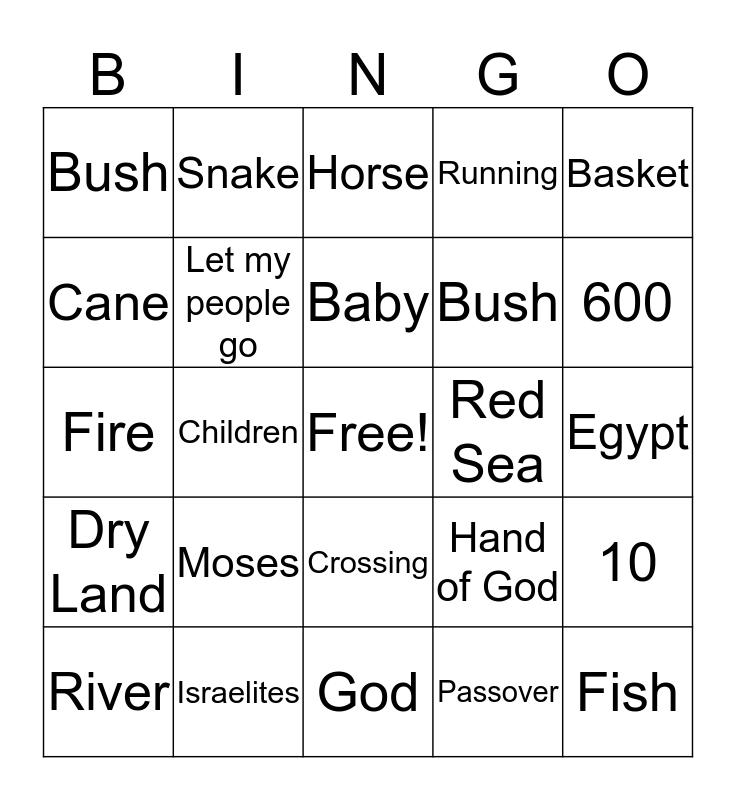 This bingo card has a free space and 24 words: Moses, Israelites, Baby, River, Basket, Bush, Cane, Snake, Red Sea, Crossing, Bush, Fire, Hand of God, 10, Let my people go, Passover, Egypt, Horse, 600, Children, Fish, Dry Land, Running and God.