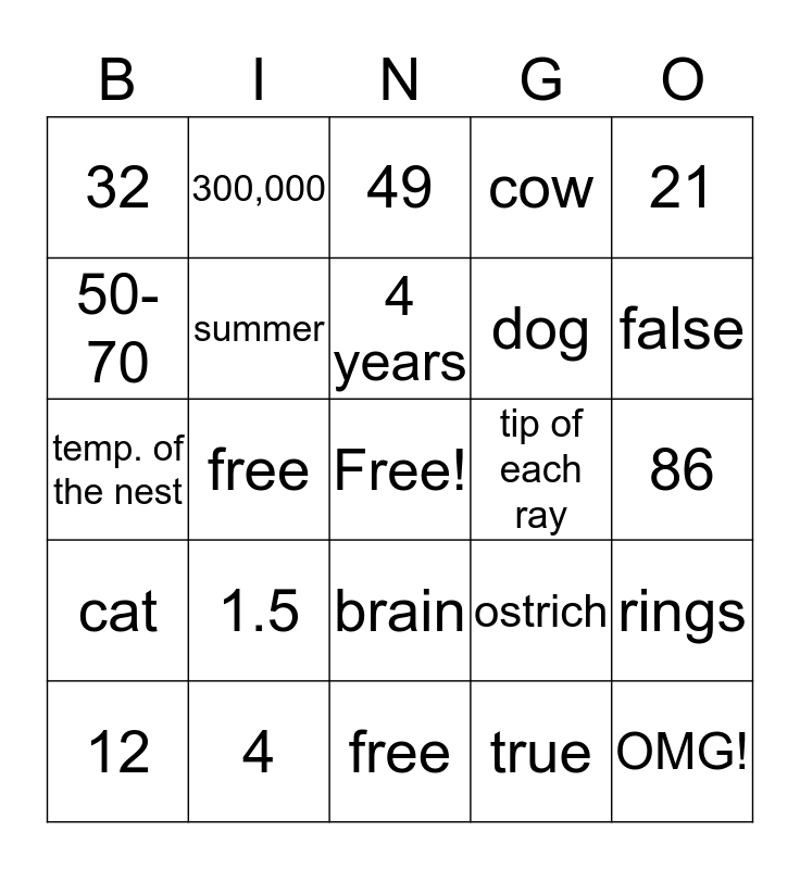 This bingo card has a free space and 24 words: 1.5, 4, 4 years, 12, 21, 32, 50-70, 300,000, tip of each ray, brain, dog, temp. of the nest, ostrich, rings, summer, true, 86, 49, false, free, OMG!, cat, cow and free.