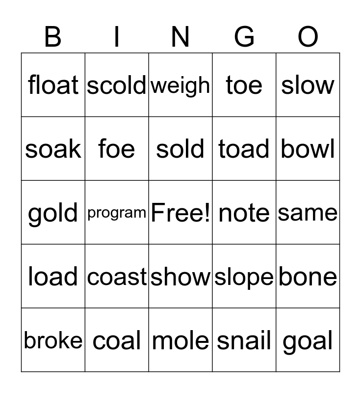 This bingo card has a free space and 24 words: coast, coal, sold, broke, slow, float, soak, scold, note, show, toad, gold, slope, bone, foe, snail, same, weigh, bowl, program, goal, load, toe and mole.