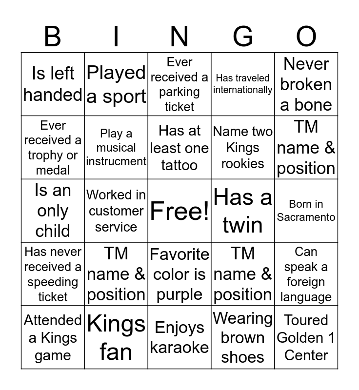 This bingo card has a free space and 24 words: TM name & position, Kings fan, Has at least one tattoo, Attended a Kings game, Never broken a bone, Is left handed, Ever received a trophy or medal, Played a sport, Has a twin, Favorite color is purple, Name two Kings rookies, Is an only child, TM name & position, Can speak a foreign language, Play a musical instrucment, Wearing brown shoes, Born in Sacramento, Ever received a parking ticket, TM name & position, Worked in customer service, Toured Golden 1 Center, Has never received a speeding ticket, Has traveled internationally and Enjoys karaoke.