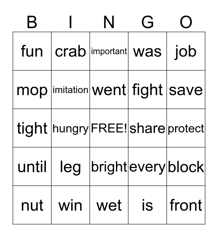 This bingo card has a free space and 25 words: leg, wet, went, nut, job, fun, mop, crab, share, bright, fight, tight, every, block, imitation, records, protect, important, save, hungry, front, win, until, was and is.
