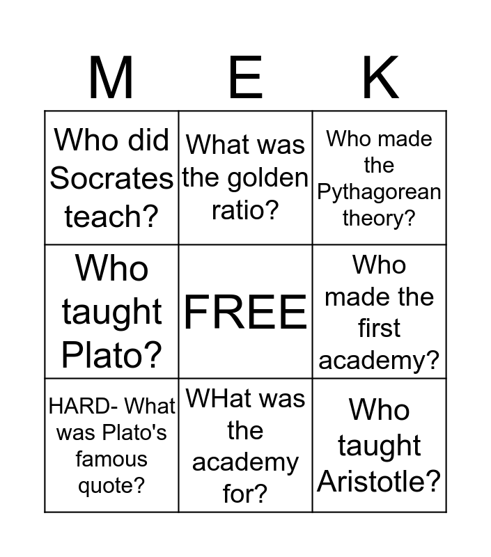 This bingo card has a free space and 8 words: Who made the first academy?, Who made the Pythagorean theory?, What was the golden ratio?, HARD- What was Plato's famous quote?, Who did Socrates teach?, Who taught Aristotle?, Who taught Plato? and WHat was the academy for?.