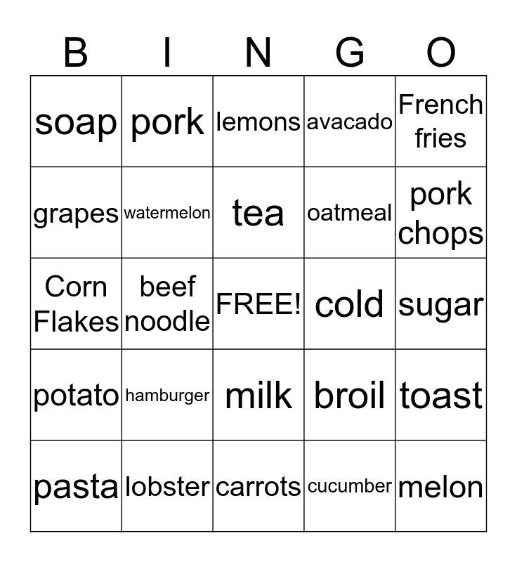 This bingo card has a free space and 24 words: hamburger, lobster, tea, pasta, French fries, soap, grapes, pork, cold, milk, oatmeal, Corn Flakes, broil, toast, watermelon, cucumber, sugar, lemons, pork chops, beef noodle, melon, potato, avacado and carrots.