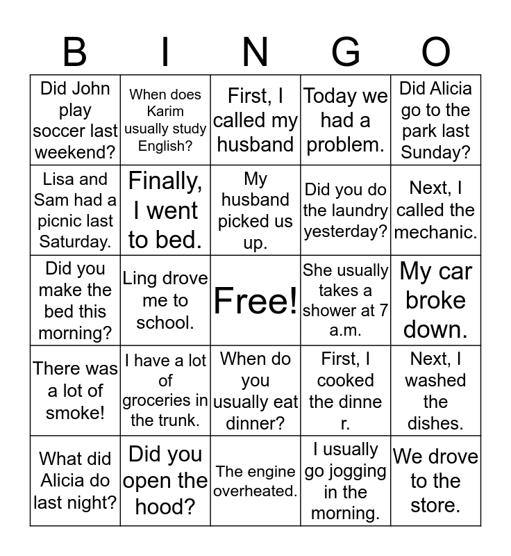 This bingo card has a free space and 24 words: I have a lot of groceries in the trunk., Did you open the hood?, My husband picked us up., What did Alicia do last night?, Did Alicia go to the park last Sunday?, Did John play soccer last weekend?, Lisa and Sam had a picnic last Saturday., When does Karim usually study English?, She usually takes a shower at 7 a.m., When do you usually eat dinner?, Did you do the laundry yesterday?, Did you make the bed this morning?, First, I cooked the dinner., Next, I washed the dishes., Finally, I went to bed., I usually go jogging in the morning., My car broke down., First, I called my husband, Next, I called the mechanic., Ling drove me to school., We drove to the store., There was a lot of smoke!, Today we had a problem. and The engine overheated..