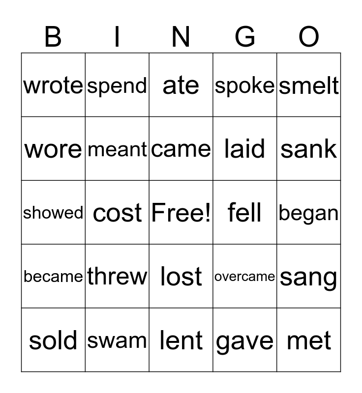 This bingo card has a free space and 24 words: threw, swam, came, sold, smelt, wrote, wore, spend, fell, lost, laid, showed, overcame, sang, meant, gave, began, ate, sank, cost, met, became, spoke and lent.