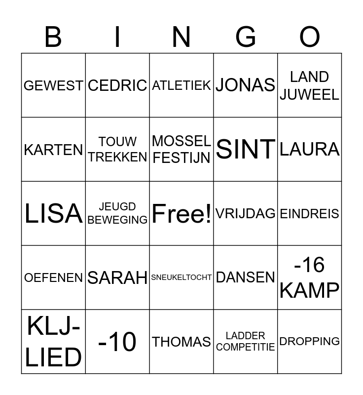 This bingo card has a free space and 82 words: LEIDING, LEDEN, ATLETIEK, MEISJES, BEKERS, VOETBAL, VRIENDEN, GALABAL, ZWEMMEN, DORPSPEL, BOSSPEL, BOWLEN, TOUW TREKKEN, VRIJDAG, ZONDAG, GEWEST, KLJ-LIED, KARTEN, PAINTBALL, KLJ-SITE, DOOP, SINT, DROPPING, LAND JUWEEL, JEUGD BEWEGING, TOON, SNAPCHAT, INSTAGRAM, FACEBOOK, LOKAAL, SARAH, GEOFFREY, LISA, NIELS, NICK, THOMAS, ZEE, ASTRID, LAURA, LIESBETH, RUIGE SPELEN, JONAS, EVI, VOLLEYBAL TORNOOI, MICHIEL, CEDRIC, FOTO’S, MOSSEL FESTIJN, NIGHT OF PASSION, KERSTFEESTJE, STARTDAG, EINDREIS, -10, -16, +16, 90 JAAR, SPORT FEESTEN, VENDELEN, WIMPELEN, DANSEN, PIRAMIDE, NAZOMER FEEST, OEFENEN, TONEEL, KLJ BEVEREN, UNIFORM, 2B, BORN 2B WILD, WATER SPELLEKES, MEIKERMIS, HALVE LITER, STREEKBIEREN AVOND, SNEUKELTOCHT, LADDER COMPETITIE, KRUISDAGEN, KAMPDANS, SJAALTJE, BLOEMEKES VERKOOP, JONGENS, +16 KAMP, -16 KAMP and KAAS- &WIJNAVOND.
