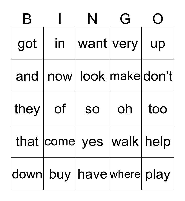 This bingo card has 25 words: come, have, look, down, up, got, and, in, oh, yes, make, they, walk, help, now, play, too, want, don't, of, so, buy, that, very and where.